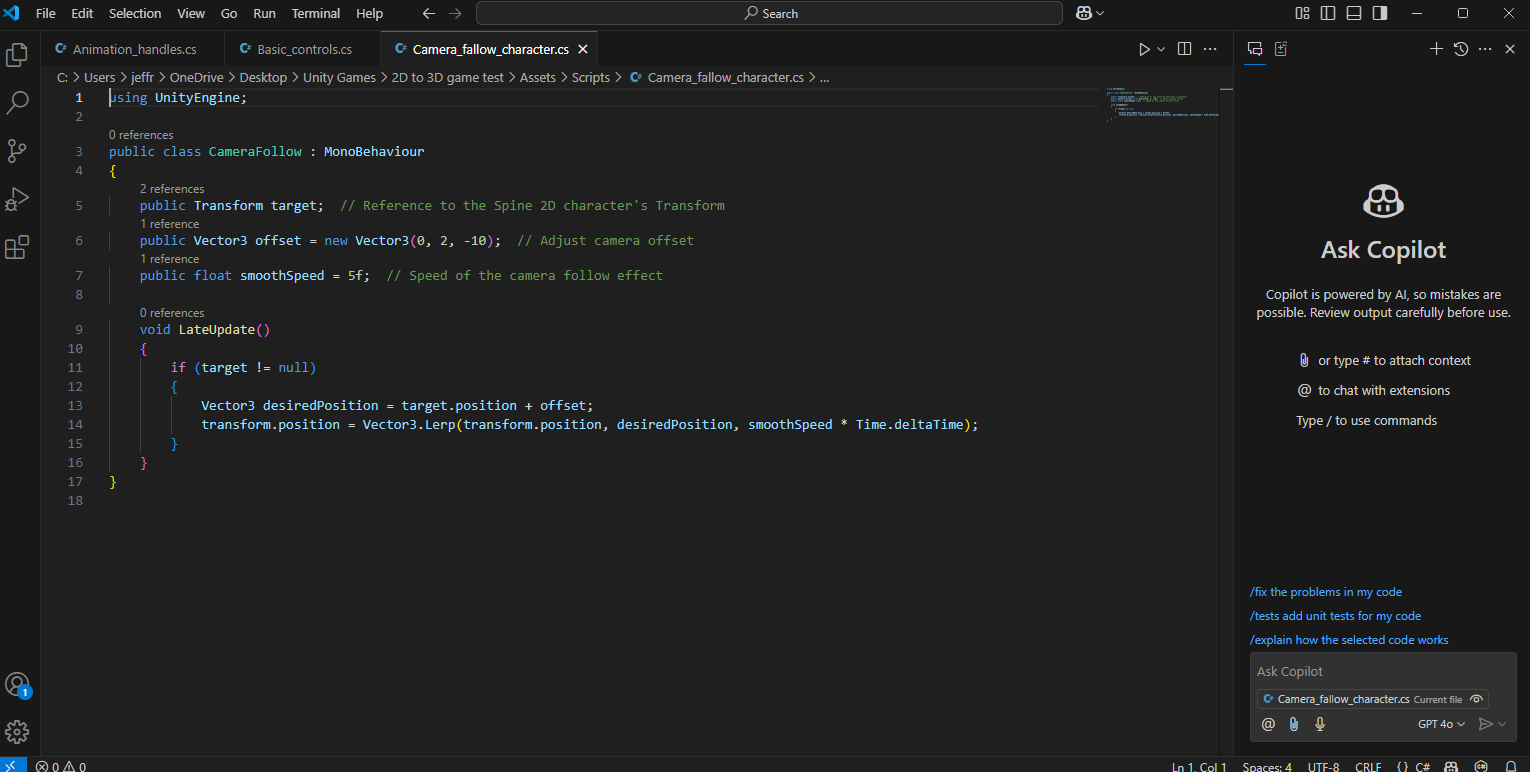 Began working on a game project test to showcase my game technical artist capabilities in the Unity Engine. I created C# script with my average knowledge in scripting, ChatGPT and GitHub Copilot. This is a work in progress and will be updated periodically with more advanced gameplay features, enemy AI and other technical developments. Scripts are down below.
